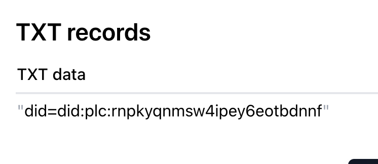 But what about custom domain handles like @baileytownsend.dev. That is done by a DNS TXT record at _atproto.baileytownsend.dev. If you don't know what DNS, that's okay. That's a bit out of scope for this post. Can just go to this link and see under TXT records it shows my did(phone number). That's the other way to look up a handle.