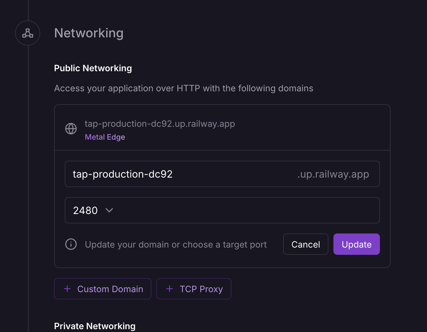 On deploy, you may have to click on the tap service, go to settings and make sure the public network domain has the correct port of 2480 and has a generated domain or can do a custom domain