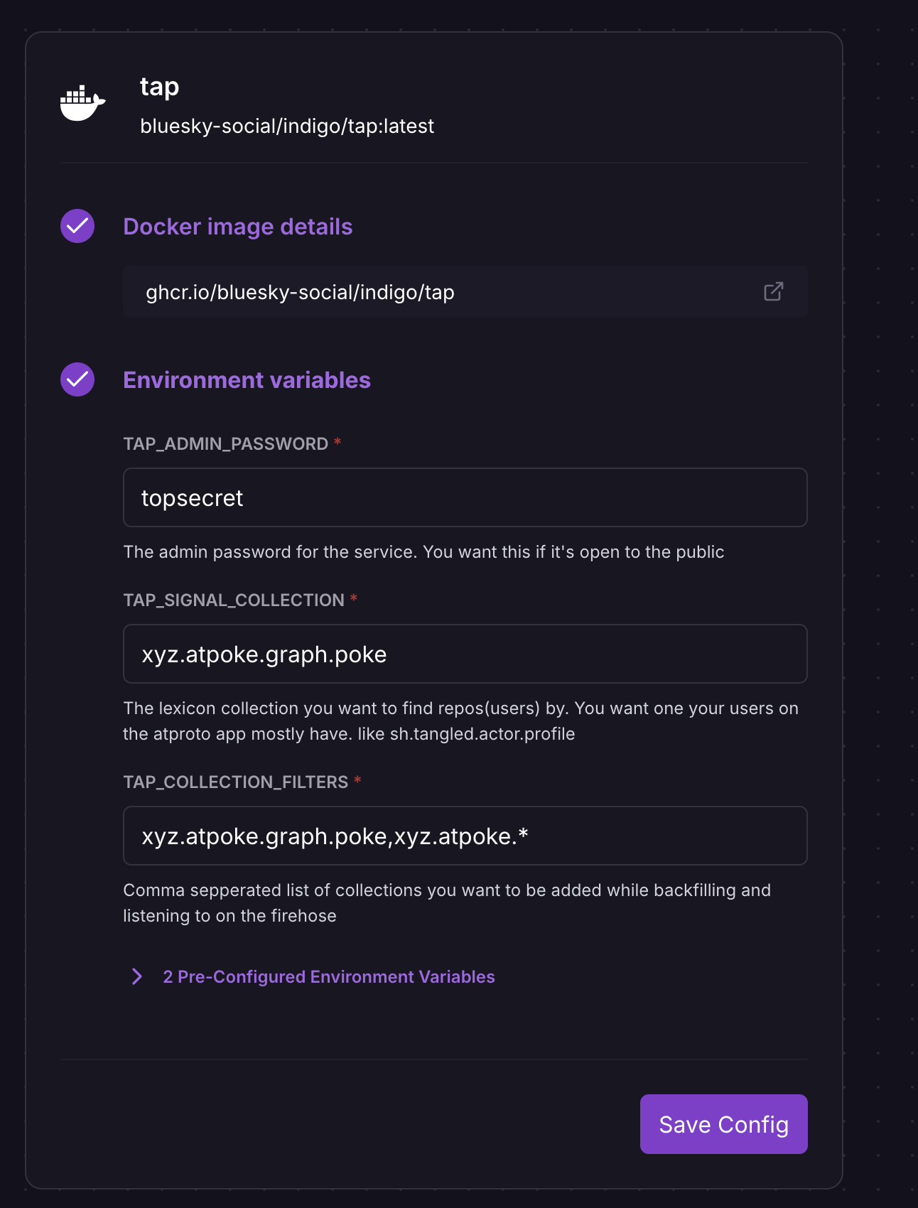 TAP_SIGNAL_COLLECTION- An env variable. Tells Tap to find every repo on the atmosphere from a relay with the collection ofxyz.atpoke.graph.poke, if it finds a repo with that, then add that repo to the list to be synced and backfill on run of those collections. You want to pick a record you think everyone who has used the atproto app has. Like a profile record on sign up.TAP_COLLECTION_FILTERS-An env variable. Tells tap to filter by repo when finding collections to backfill or watch for in the future from the firehose. You want to use the nsid